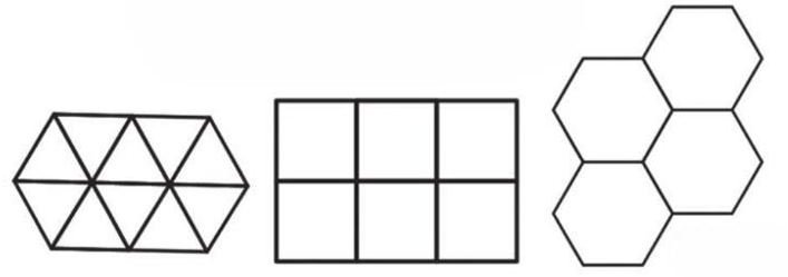 Para mostrar a veracidade dessa conjectura de forma simples, buscamos encontrar uma forma geométrica bidimensional que pudesse ser repetida indefinitivamente para cobrir uma área plana, de modo que o comprimento total dos perímetros das células fosse o menor possível para uma mesma área. Em (1), foi mostrado que só é possível preencher o plano com o mesmo polígono retangular “sem deixar espaço” usando triângulos equiláteros, quadrados e hexágonos regulares.