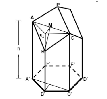 Vamos considerar ℎ a medida entre a base hexagonal e os vértices 𝐴 e 𝐶. Temos que, a medida do segmento $𝐵_𝑀$ equivale à medida de $𝑃_𝑀$ e a medida de $𝐵_1𝑀$ equivale à altura do triângulo 𝐴′𝐵′𝐶′. Daí, aplicando o Teorema de Pitágoras no triângulo $𝐵𝐵_1𝑀$, temos: