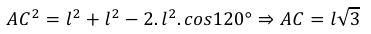 Para descobrir a área total, vamos determinar, primeiramente, cada área ($𝐴_𝐿$) dos losangos congruentes. Sendo 𝑙 a medida de cada lado do hexágono regular (𝐴′𝐵′𝐶′𝐸′𝐹′) da base e observando que a diagonal $\overline{AC}$ pode ser projetada ortogonalmente na base hexagonal gerando o segmento $\overline{A’C’}$ com mesma medida, temos que o triângulo 𝐴′𝐵′𝐶′ é isósceles e, aplicando a lei dos cossenos, obtemos: