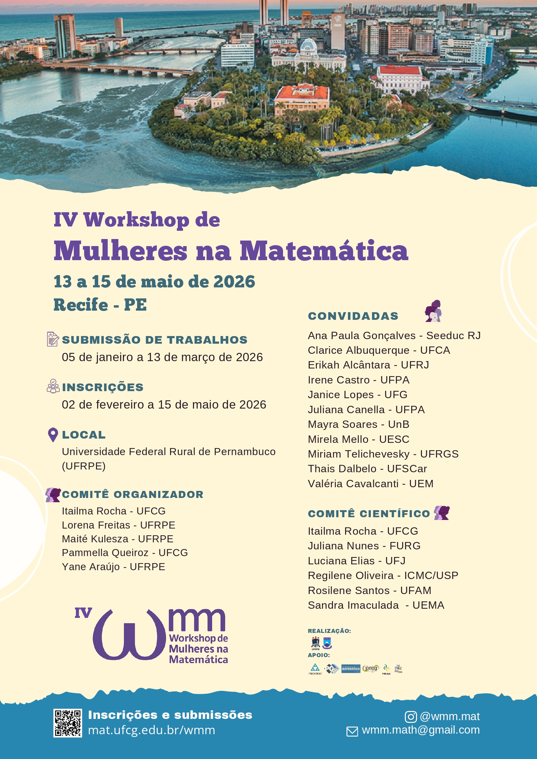 O IV Workshop de Mulheres na Matemática – WMM acontecerá nos dias 13 a 15 de maio de 2026 na Universidade Federal de Rural de Pernambuco – PE.