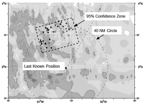 O retângulo obtido pelo grupo de oceanográficos foi utilizado nas buscas de acústica ativa, em abril e maio de 2010. Para realização dessas buscas foram utilizadas duas equipes, uma da Marinha dos EUA junto com a Phoenix International que usou um sistema de sonar de varredura lateral rebocado. E a outra do Woods Hole Oceanographic Institute que usou sistemas autônomos de veículos aquáticos com sonares de varredura lateral e veículo operado. Infelizmente as buscas dentro da área demarcada pelo retângulo da Figura 2 assim como as anteriores não foram bemsucedidas.