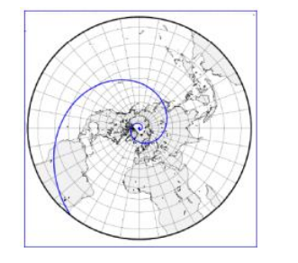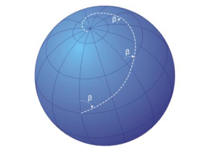 Outro local que podemos ver essa espiral é na Loxodromia. Esta é a linha que faz um ângulo constante com todos os meridianos, na superfície da Terra, ela não é o caminho mais curto entre dois pontos, mas é o trajeto mais simples e normalmente empregado em mapas rodoviários ou marítimos. Ao seguir a rota loxodrômica o navio não dará a volta ao mundo regressando ao ponto de partida. E é essa projeção estereográfica da linha loxodrômica no plano tangente ao polo que percebemos uma espiral (RESENDE, 2017).