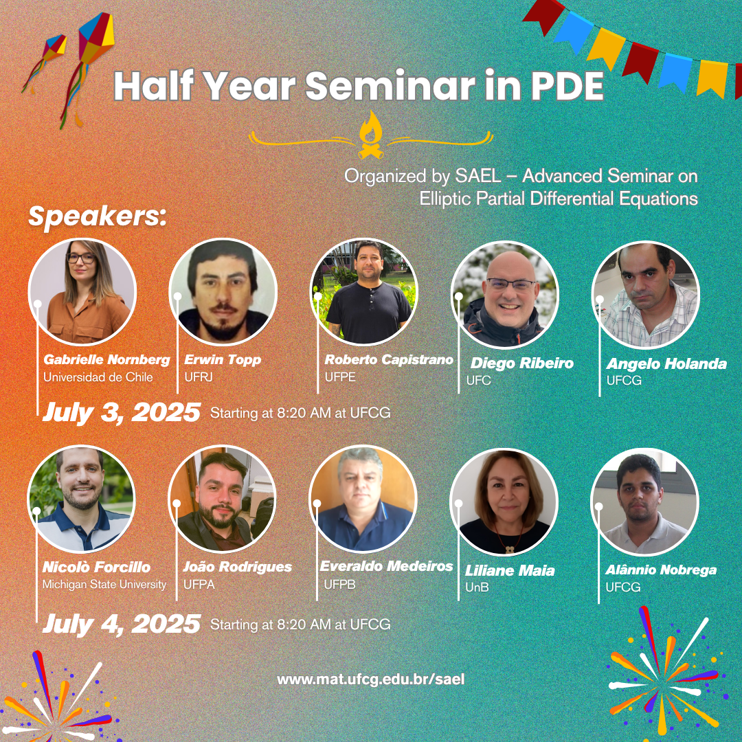 SAEL was created to strengthen the collaboration among members of the Mathematics Department at UFCG, which hosts a strong group of researchers with expertise in elliptic PDEs. The seminar offers a space to present recent results, explore new methods, discuss ongoing work, and most importantly, encourage joint research efforts.